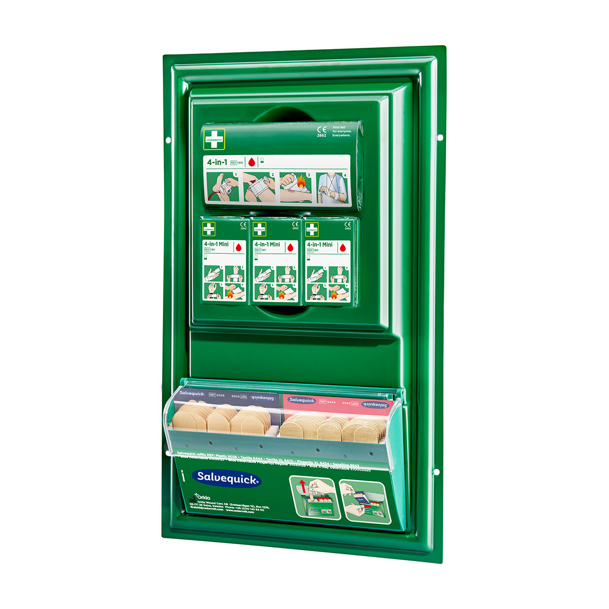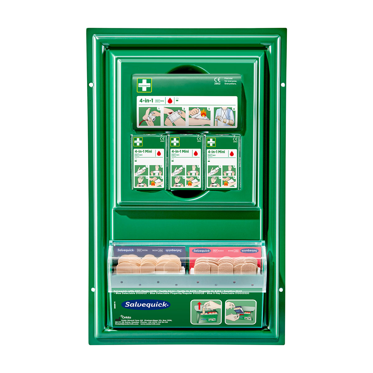 Førstehjelpsvegg Mini er en mindre førstehjelpsstasjon med 80 stk. plasterstrips, 1 stor og 3 små blodstoppere. Egner seg der det er liten plass eller som supplement til annet førstehjelpsutstyr.
