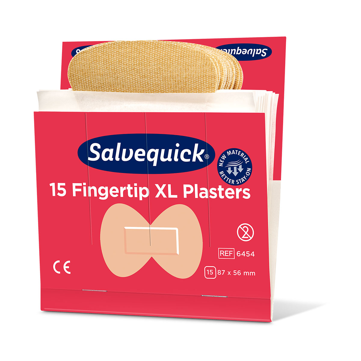 Salvequick ekstra store fingertupplaster er et smidig tekstilplaster for fingerskader. Plasteret er allergitestet, lett å sette på og er fleksibelt i bruk. Hver eske består av 6 refiller.