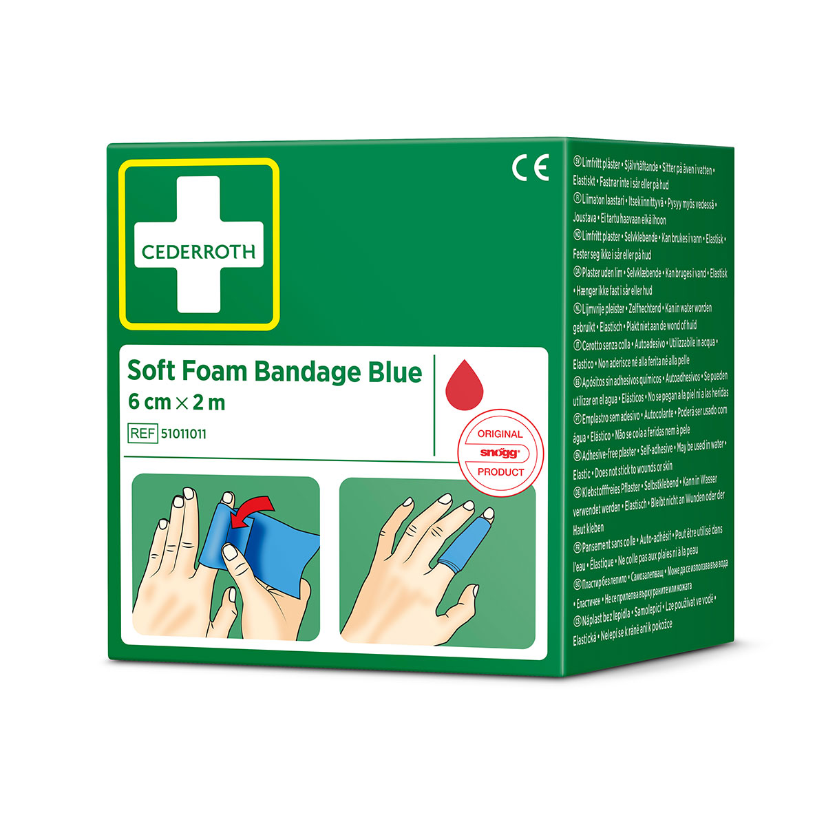 Cederroth Soft Foam Bandage fungerer både som plaster og som bandasje. Den er selvheftende, uten lim, og kleber seg derfor ikke fast i hud eller hår. Den blå fargen er beregnet for bruk i næringsmiddelindustrien.