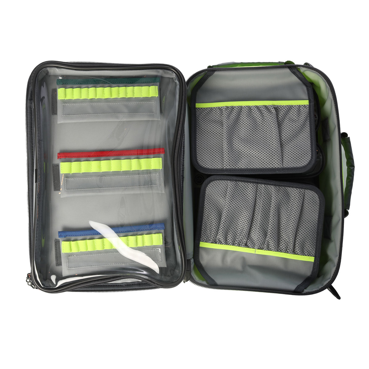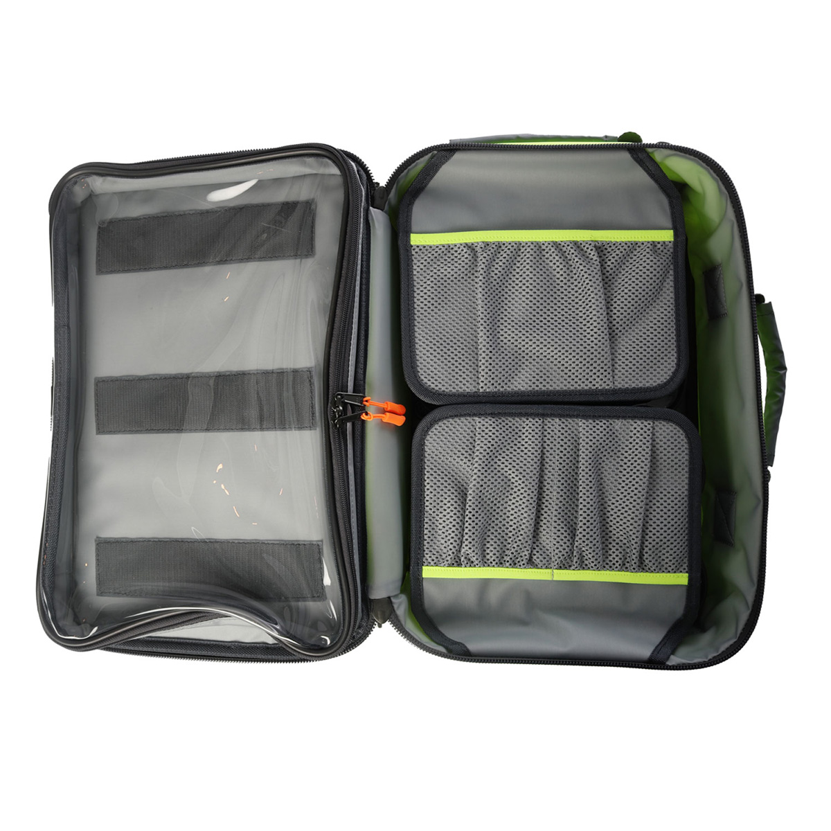 - Utbrettbare midtbrett med nettinglommer på den ene siden og gjennomsiktig lomme med glidelås på den andre siden.