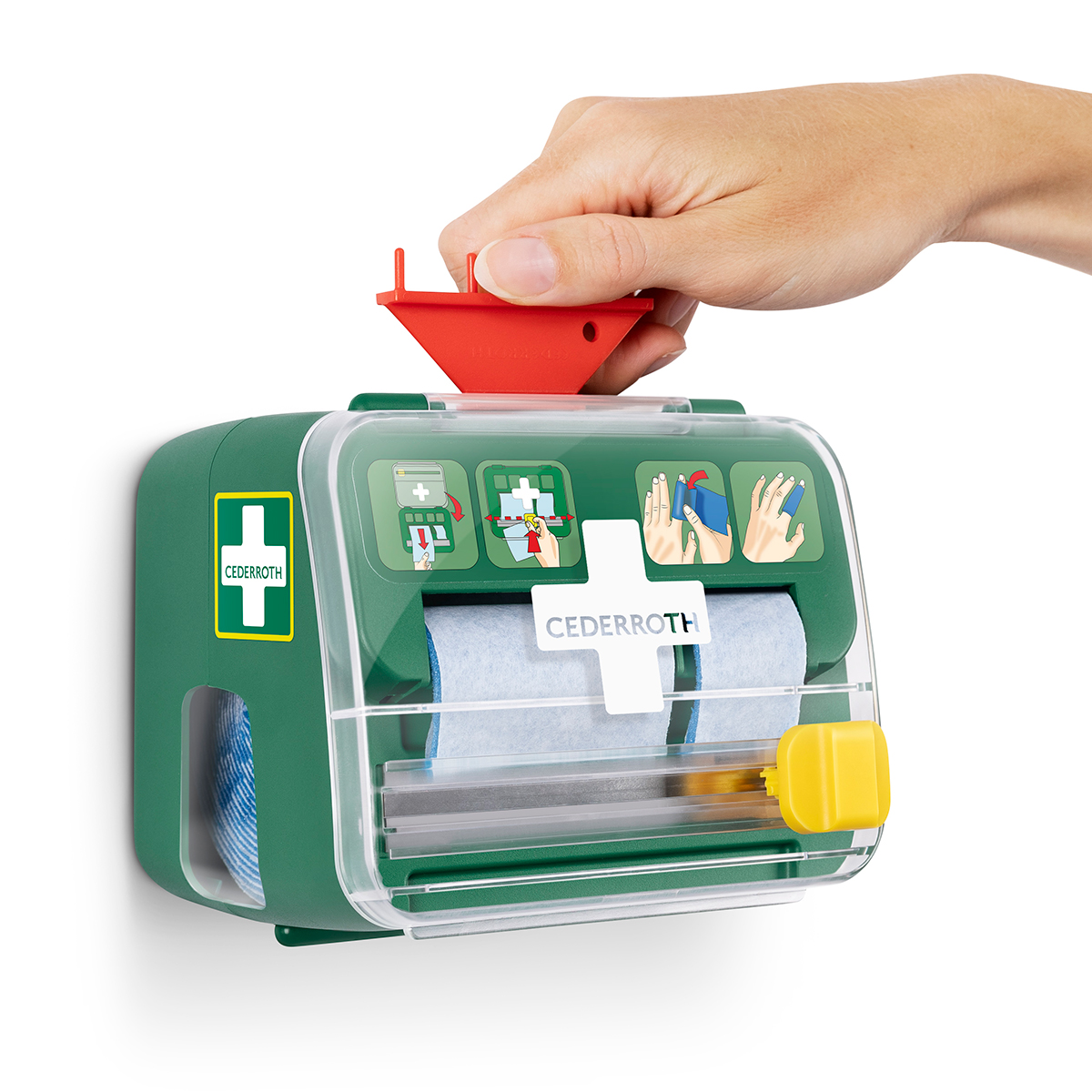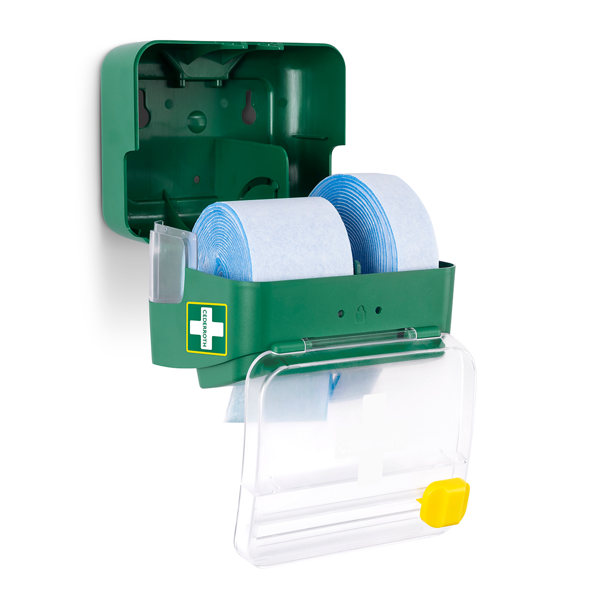 Dispenseren har en integrert kniv for enkel bruk med tydelige instruksjoner. Kompakt størrelse som gjør det enkelt å montere på veggen, selv på små flater. Dispenseren kan låses for å forhindre svinn og kan enkelt åpnes med en refillnøkkel. Transparent lokk beskytter produktene mot støv og smuss.