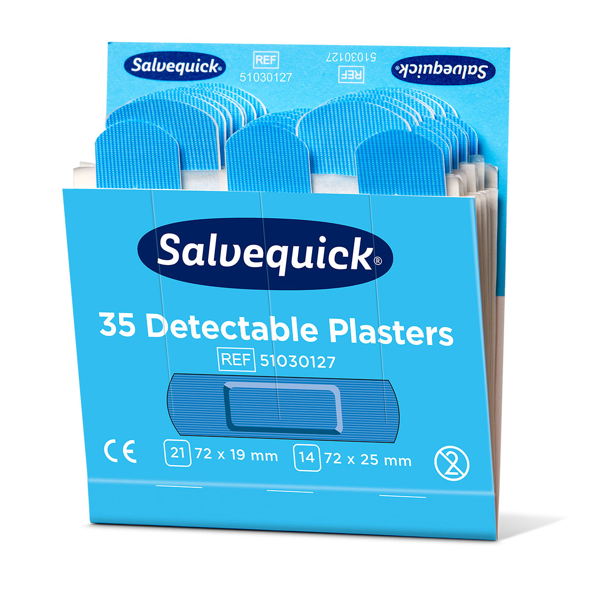 Plastrene er detekterbare og oppdages av de fleste metalldetektorer. Den blå fargen gjør at plasteret også er lett å oppdage visuelt. Plastrene er allergitestet. De er lette å sette på, og fleksible og smidige i bruk. Rengjør såret, sørg for at det ikke er infiser og skift plaster hver dag.