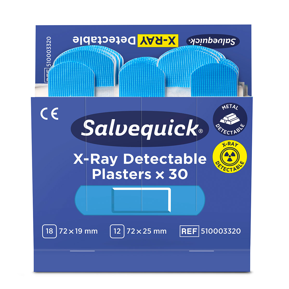 Plastrene er både røntgen- og metalldetekterbare. Den blå fargen gjør at plastrene er lette å oppdage visuelt. Plastrene er vanntette og allergitestet. De er lette å sette på, og fleksible og smidige i bruk. Passer til Salvequick plasterautomat.