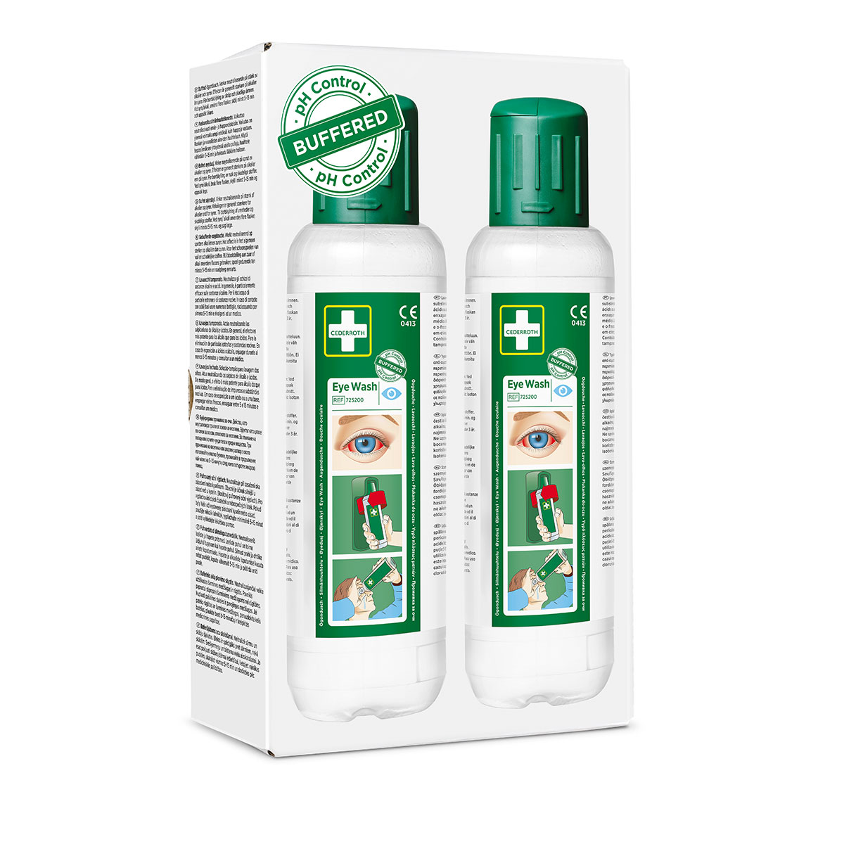Cederroth øyedusj inneholder en steril, bufret saltløsning. Flasken er lett å åpne og åpnes i ett steg ved å vri korken rundt. Den integrerte øyekyllekoppen hjelper til med å holde øyet åpent under skylling og gir en rik strøm av væske. Cederroth Øyedusj er beregnet for bruk å skylle bort støv, rusk, fremmedlegemer og skadelige stoffer. Cederroths bufrede øyedusj har også en nøytraliserende effekt på sprut av alkalier og syrer. Generelt er effekten sterkere på alkalier enn på syrer. Øyedusj-flaskene anbefales også å brukes under transport til sykehus.
