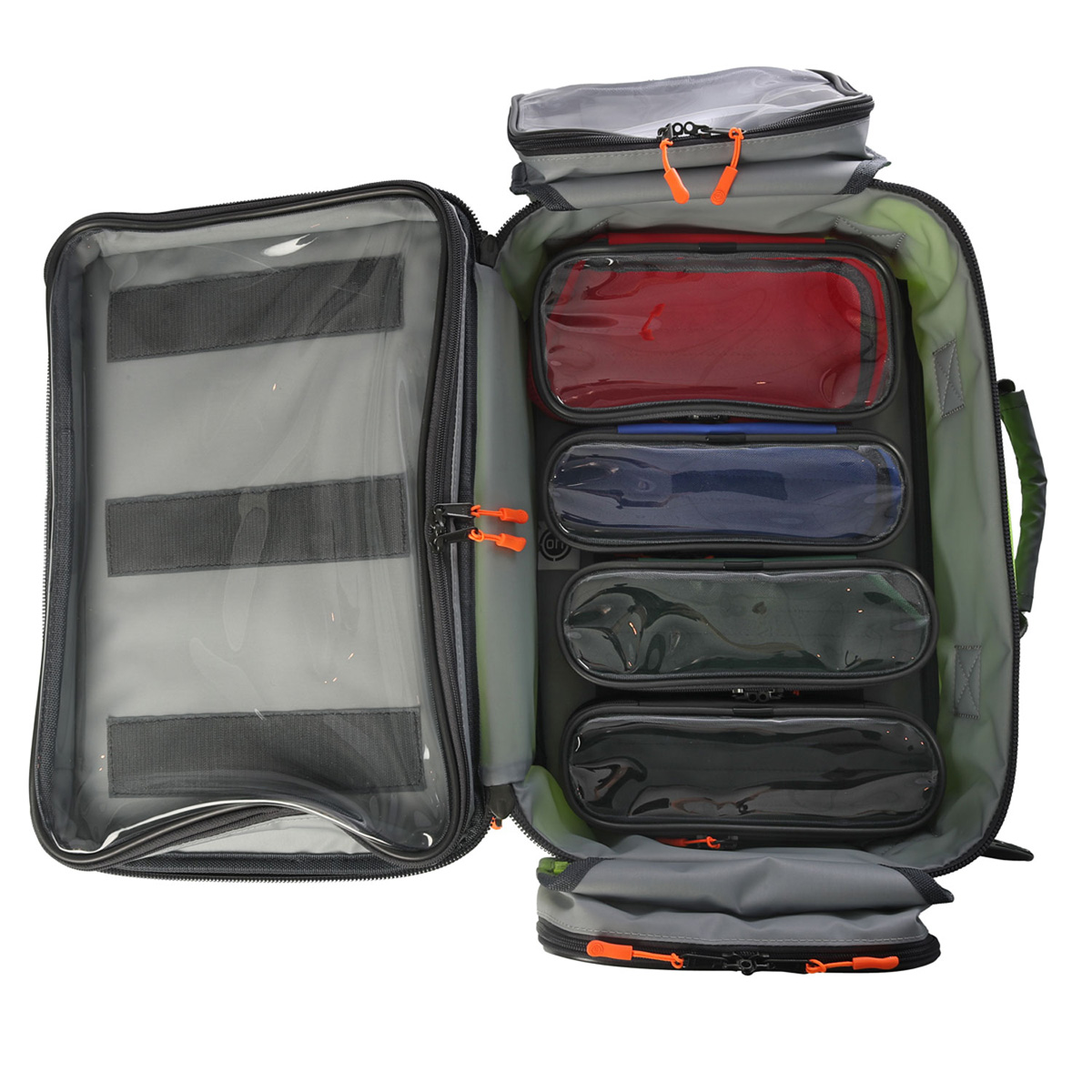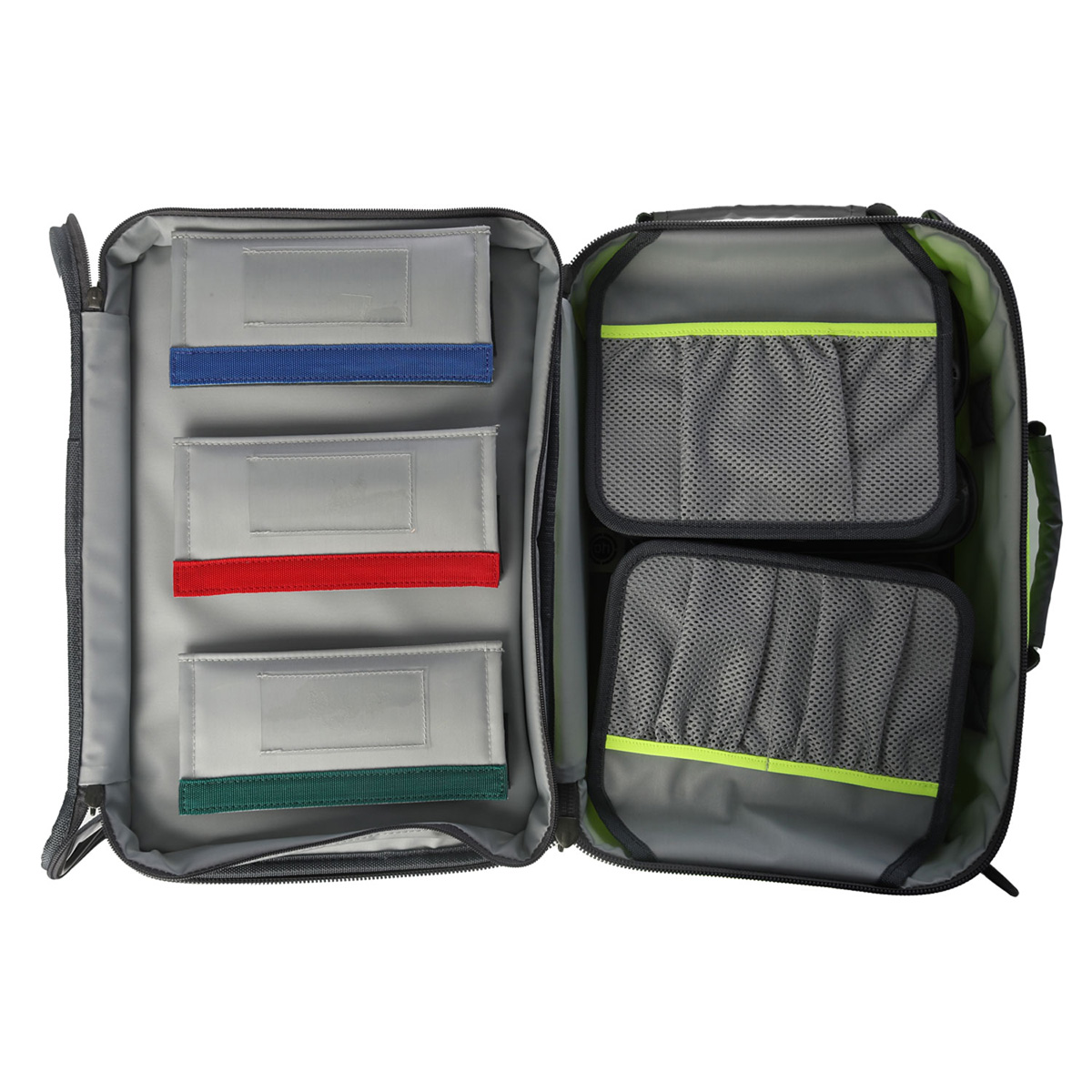 - Utbrettbare midtbrett med nettinglommer på den ene siden og gjennomsiktig lomme med glidelås på den andre siden.