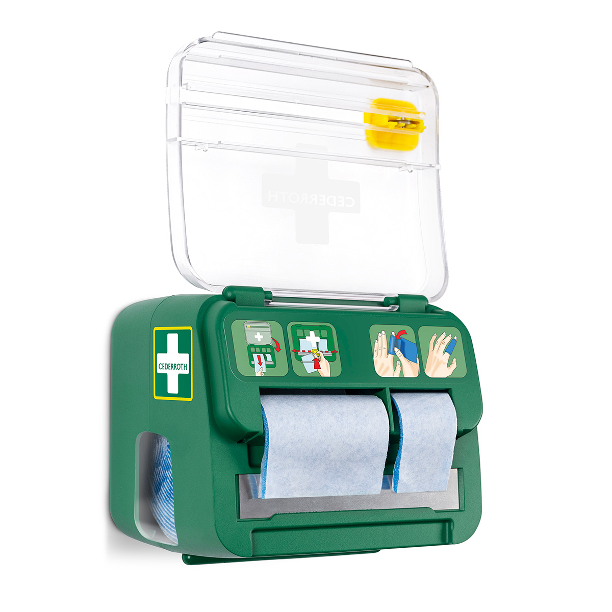 Dispenseren har en integrert kniv for enkel bruk med tydelige instruksjoner. Kompakt størrelse som gjør det enkelt å montere på veggen, selv på små flater. Dispenseren kan låses for å forhindre svinn og kan enkelt åpnes med en refillnøkkel. Transparent lokk beskytter produktene mot støv og smuss.