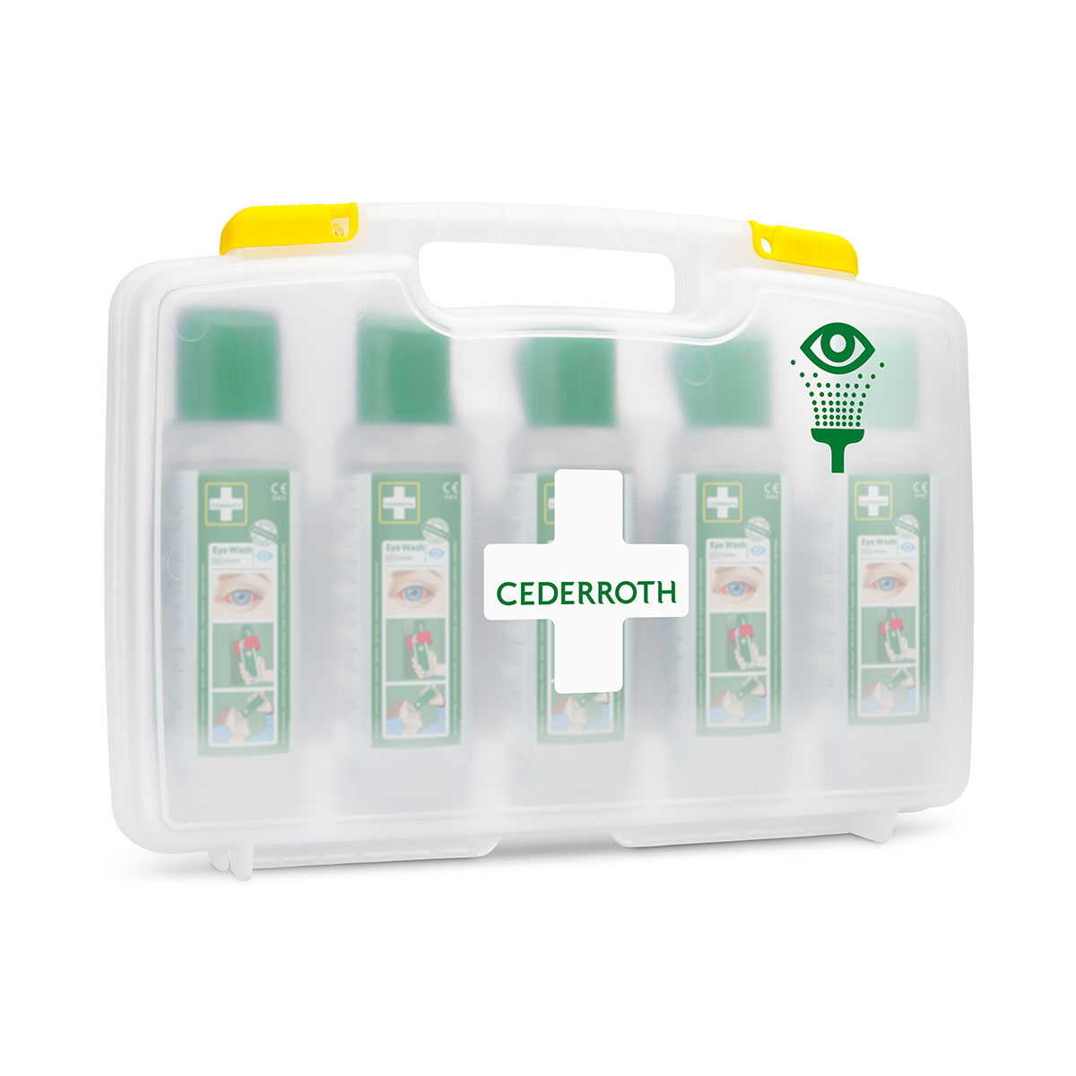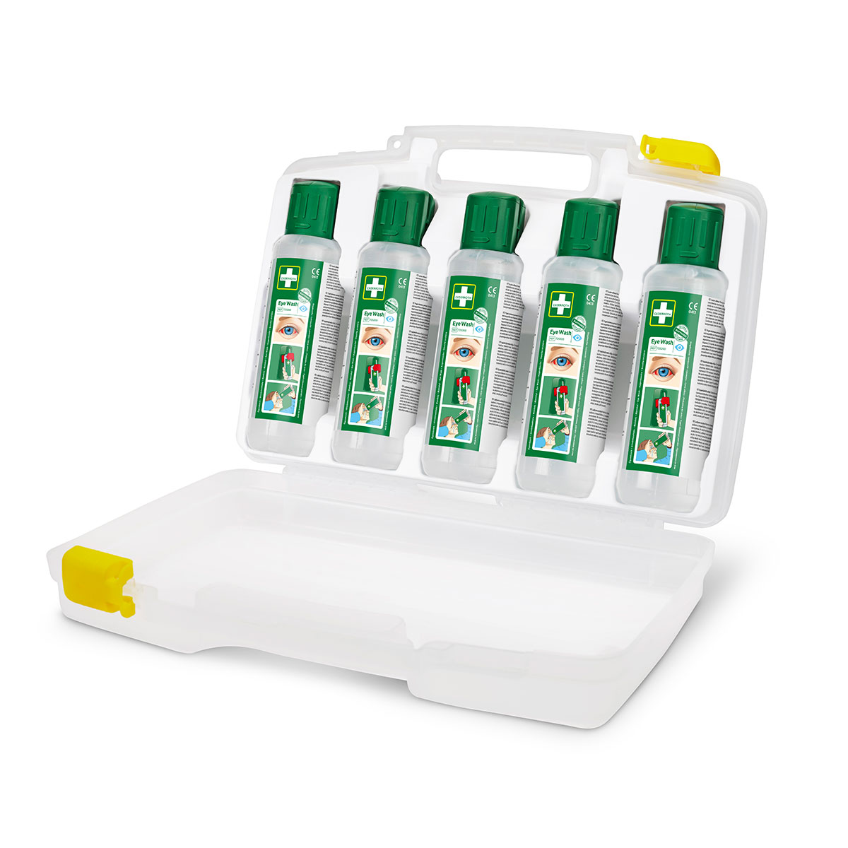 Cederroth øyedusjflasker (5 x 500 ml) i bærbar koffert (tidl.7255) Praktisk å bære med seg for eksempel ved mobilt arbeid eller under transport til sykehus. Koffert av hardplast med håndtak og gjennomsiktig lokk. Veggholder (art.nr 51011041) medfølger ikke.
