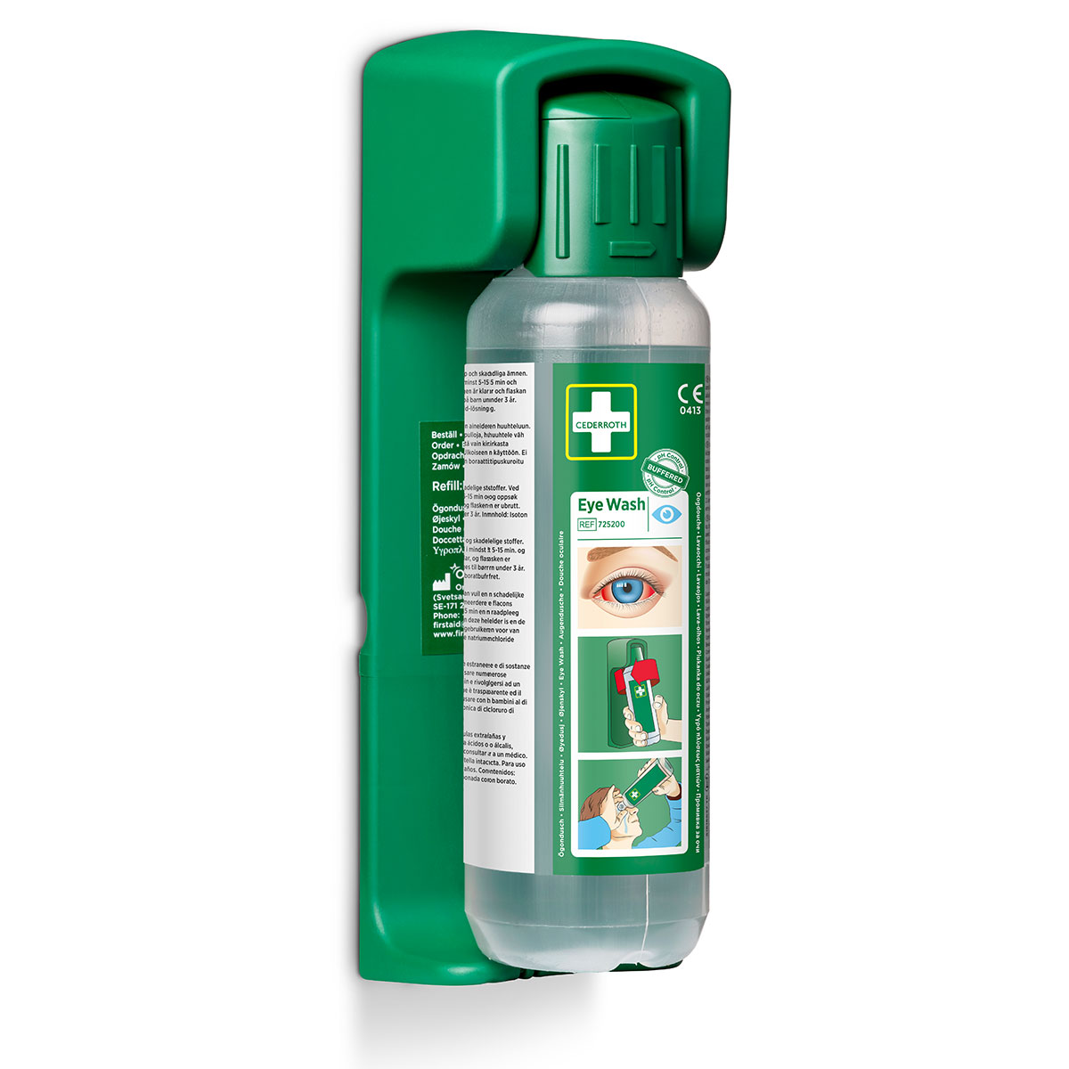 Praktisk veggholder til Cederroth øyeskylleflaske 500 ml (produktnr. 725200). Med veggholderen får flasken en bestemt plass slik at alle vet hvor den finnes. Flasken sitter fast i veggholderen og åpnes automatisk når den vris ut av holderen – øyeskyllingen kan starte øyeblikkelig. Etterlysende instruksjonsskilt medfølger.